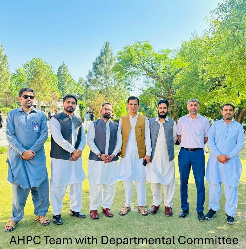 In FA24 BS Medical Laboratory Technology (MLT) was launched under the umbrella of department of Biotechnology. MLT is the healthcare branch which is being accredited from the Allied Health Professional Council (AHPC). Team comprising of three members namely Dr. Muhammad Arshad, Mr. Bilal Ahmad, Mr. Salman Ahmad visited COMSATS Abbottabad on 28th April, 2025 for zero visit to brief the department about accreditation procedure and associated documentation. A committee comprising Prof. Dr. Jamshaid Hussain (Head, department), Dr. Abdul Rahman, Dr. Imran Hussain, Dr. Basit Shah, and Dr. Ghazal Khurshid met the team and briefed them about the program vision, the scheme of studies, lab establishment for MLT and faculty requirement. The team visited the already established labs and then also met the worthy Prof. Dr. Shahid Khattak along with the committee. They were satisfied with the planned framework for the strengthening of MLT in CUI Abbottabad.