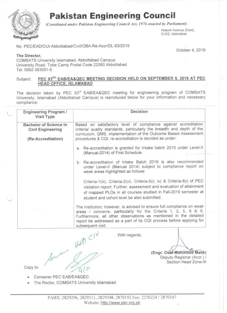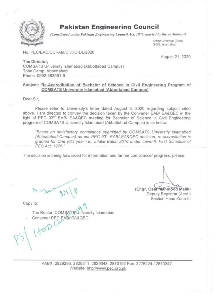 On August 2020, based on satisfactory compliance submitted by COMSATS University Islamabad, Abbottabad campus as per PEC 93rd EA&QEC decision, re-accreditation is granted for one(01) year i.e. Intake batch 2016 under Level-II, First Schedule of PEC Act, 1976.