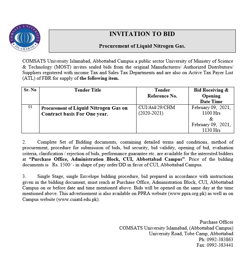 Tender No. CUI/Atd/29/CHM (2020-2021)